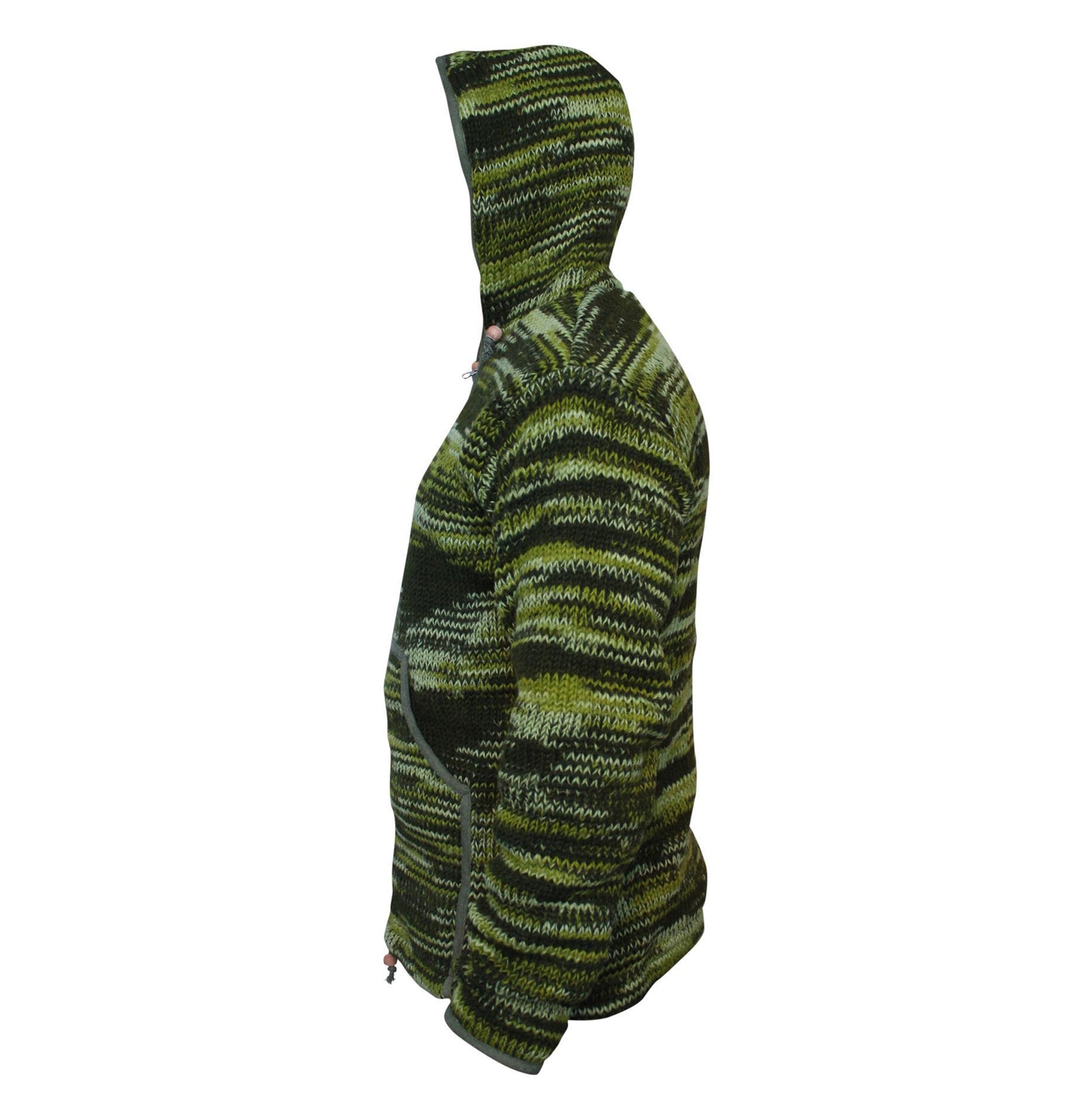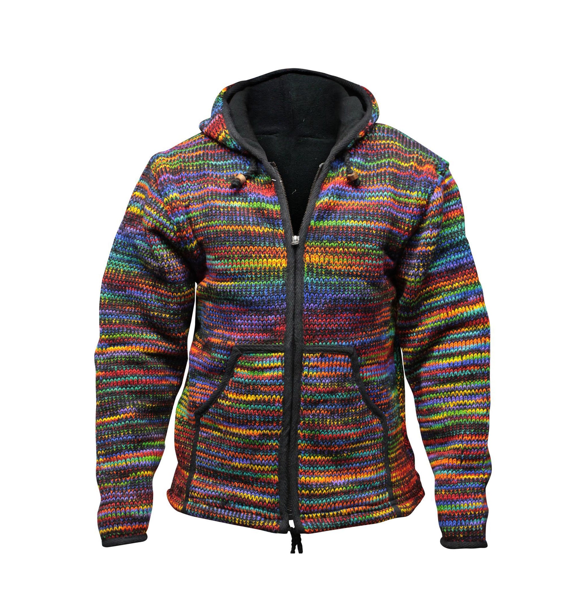 Handmade in Nepal, this men’s winter coat is crafted with 100% fine wool on the outside and a soft fleece lining on the inside, offering exceptional warmth and comfort. The tie-dye knitted pattern adds a unique flair, while the double-knitted construction ensures durability and insulation.