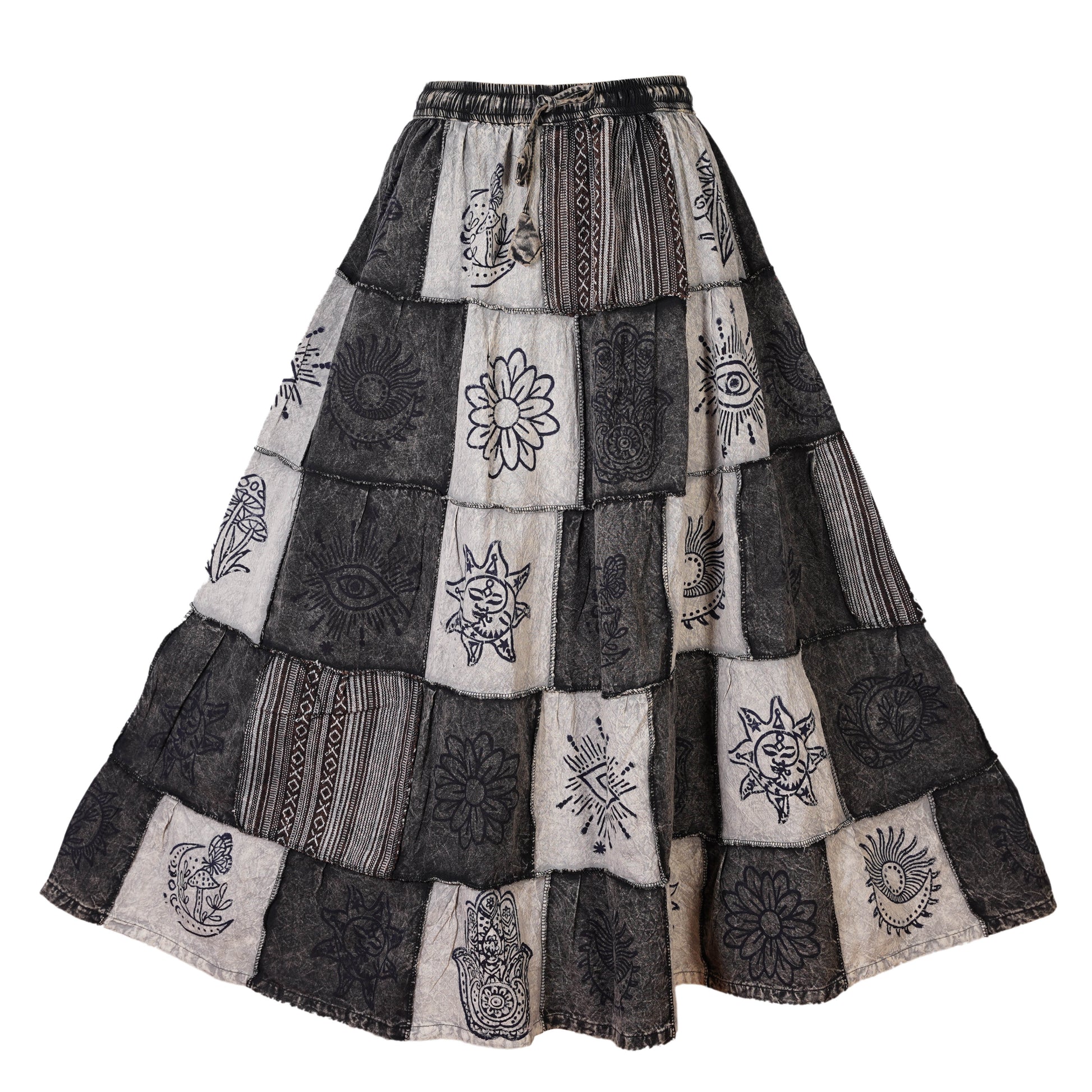Ezhippie brings you a handcrafted women’s long skirt made from 100% cotton, designed with bold patchwork and symbolic prints. This bohemian woman's full skirt features an A-line silhouette and adjustable elastic waistband, offering comfort with effortless boho style.