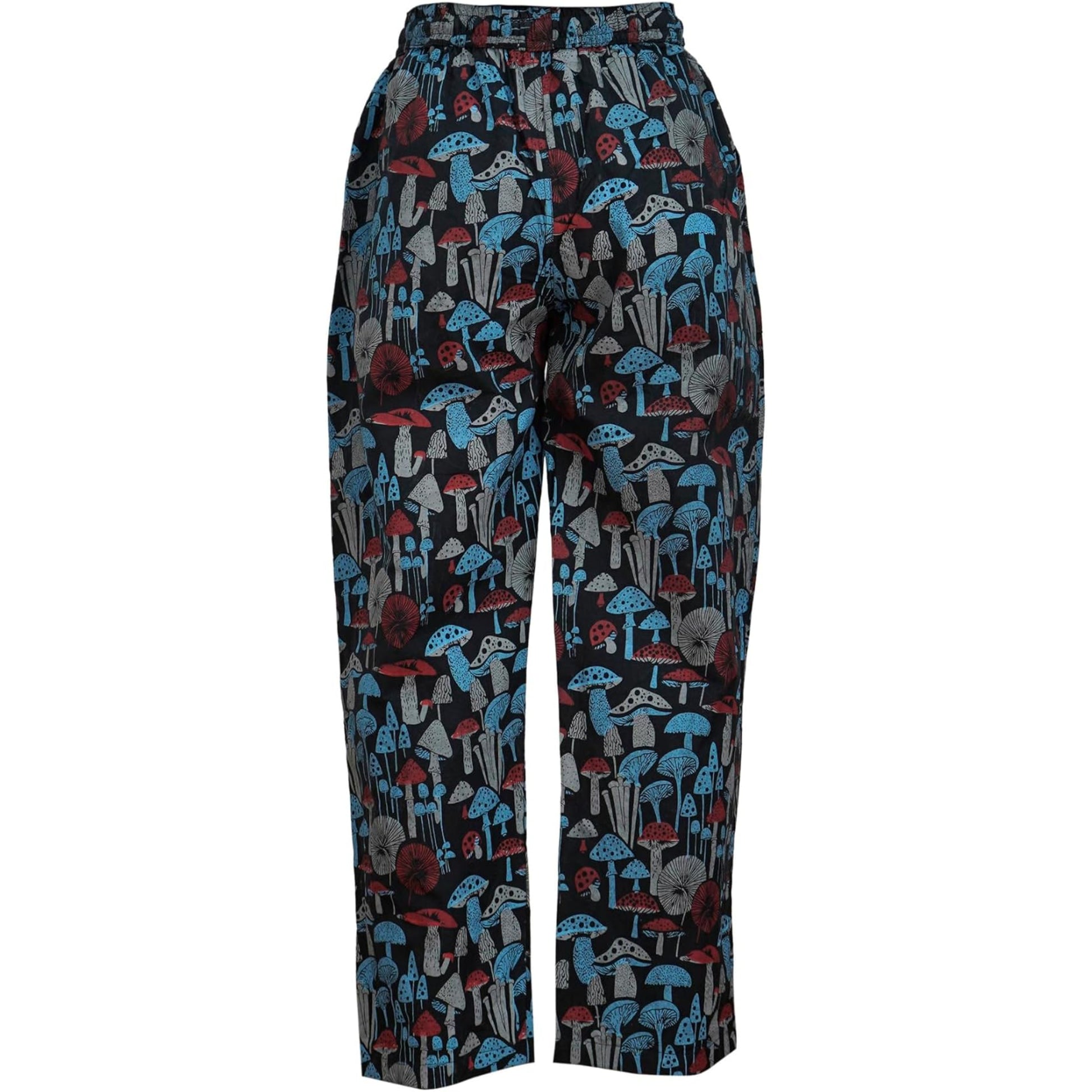 Elevate your style with our women's boho trousers, crafted from breathable 100% cotton fabric for unmatched comfort during all-day wear. Featuring a vibrant mushroom print, these loose-fitting hippie pants add a playful and trendy vibe to your wardrobe. Designed with an elasticated waist and drawstring, they ensure a customized fit, making them ideal for all body types.