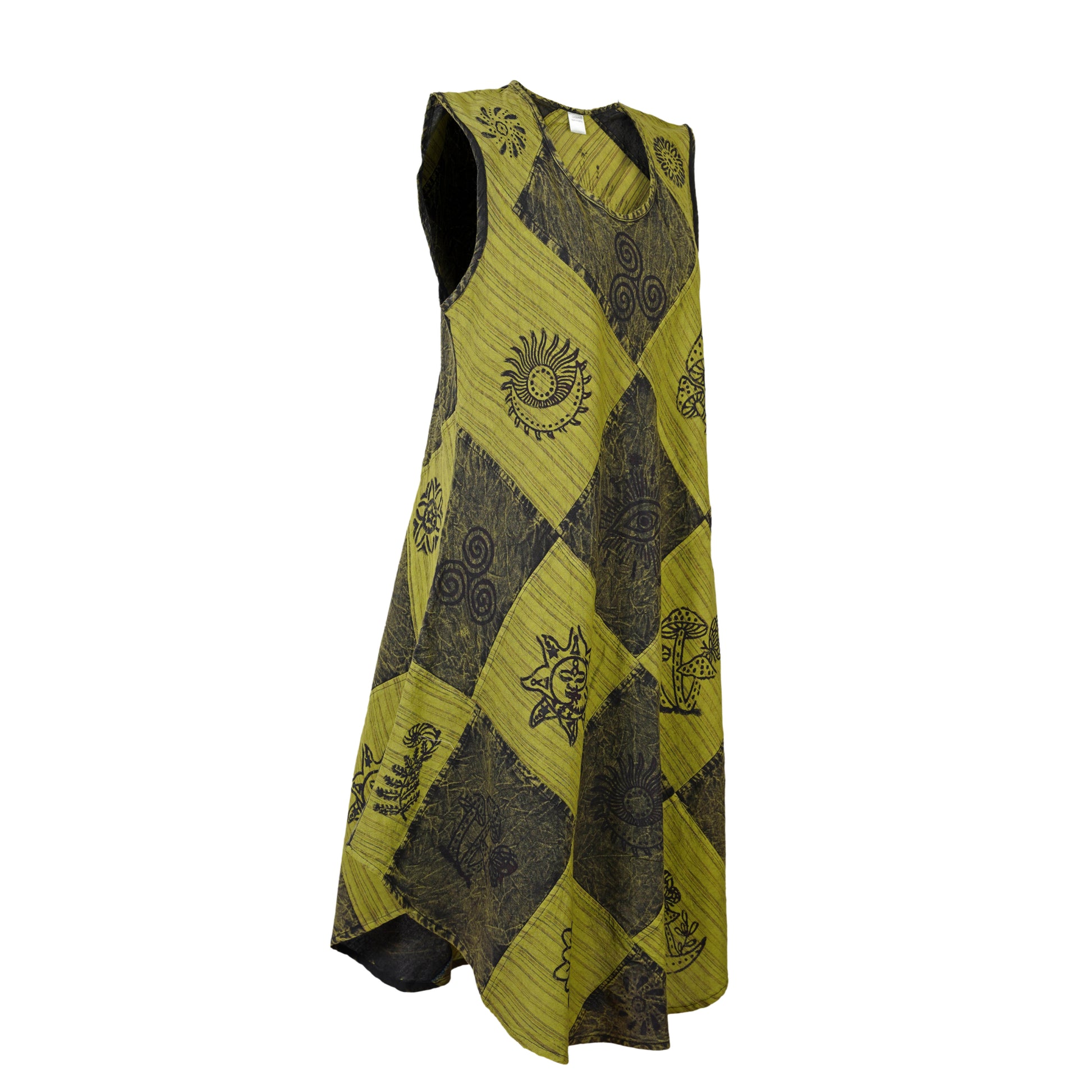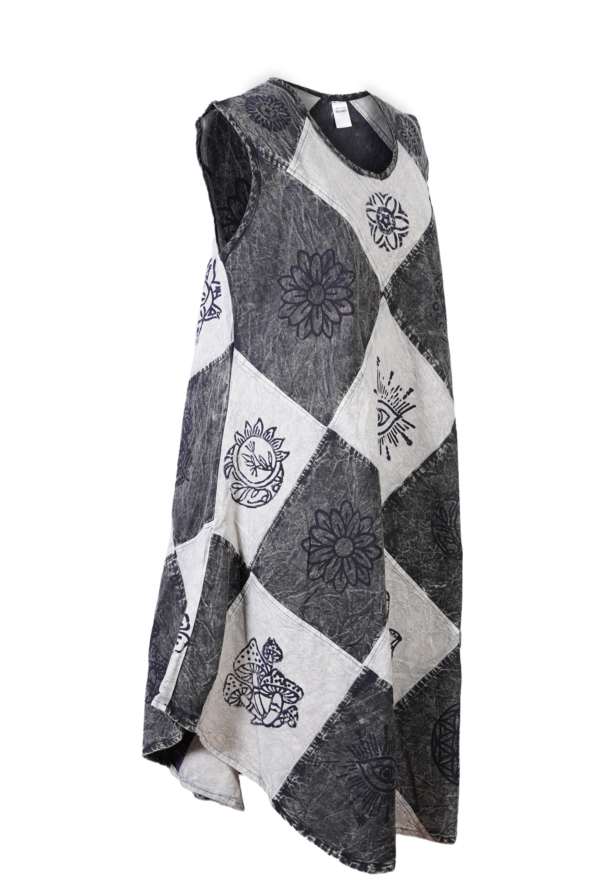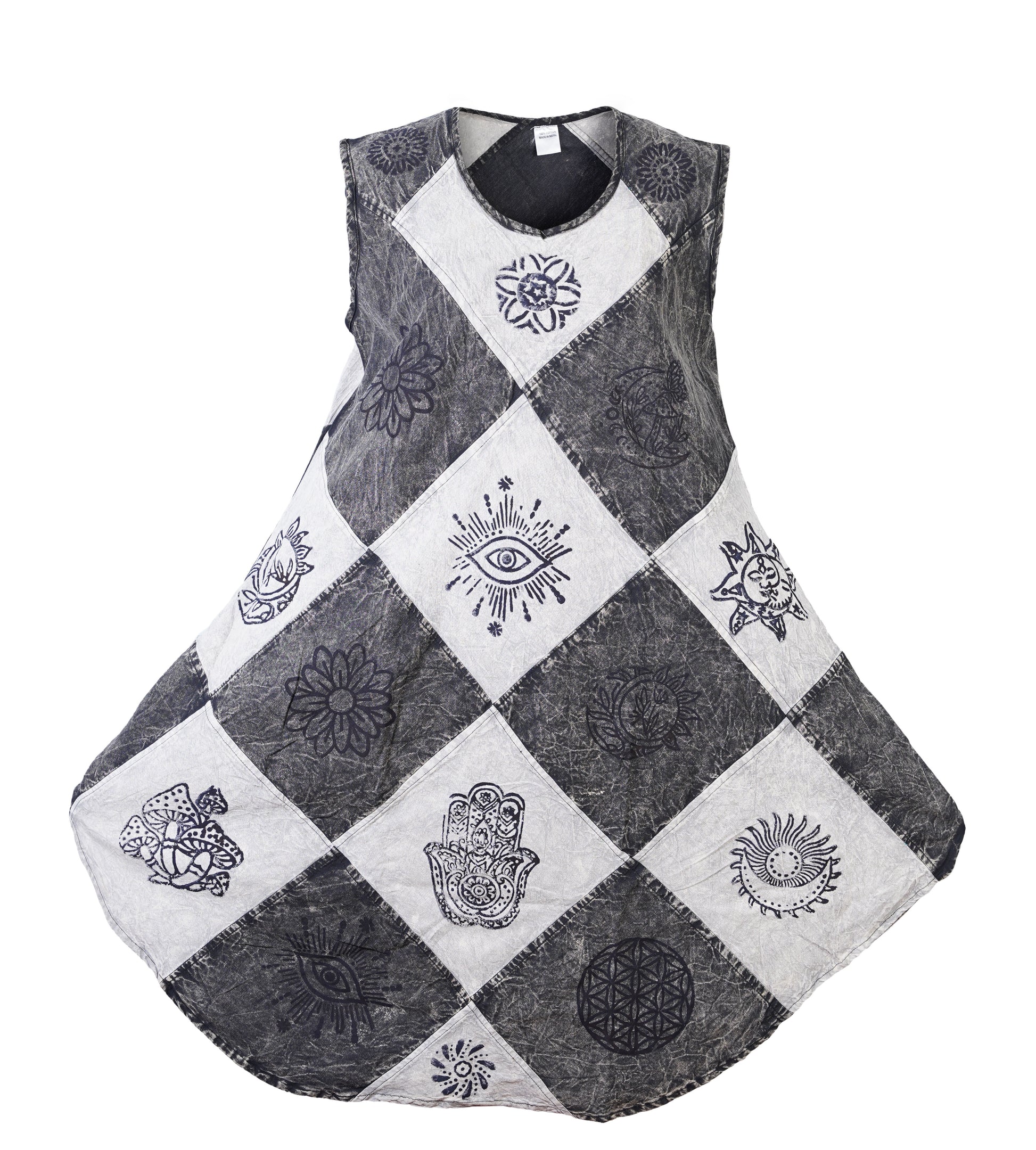 Ezhippie brings you a bohemian-inspired sleeveless patchwork dress crafted from 100% breathable cotton. Featuring hand-printed spiritual and ethnic symbols across a unique diamond-shaped layout, this sun dress for women offers airy comfort and standout style. The sleeveless cut, round neckline, and flared hem create a flattering silhouette perfect for sunny days and casual moments.