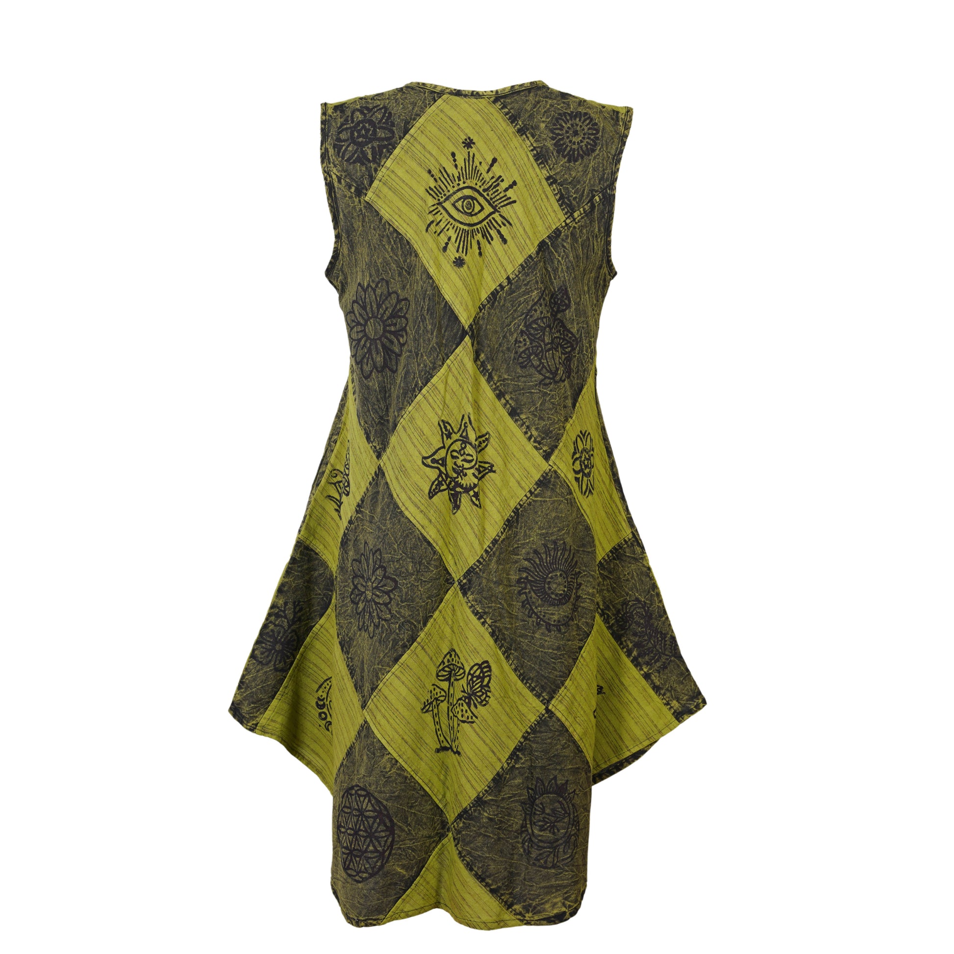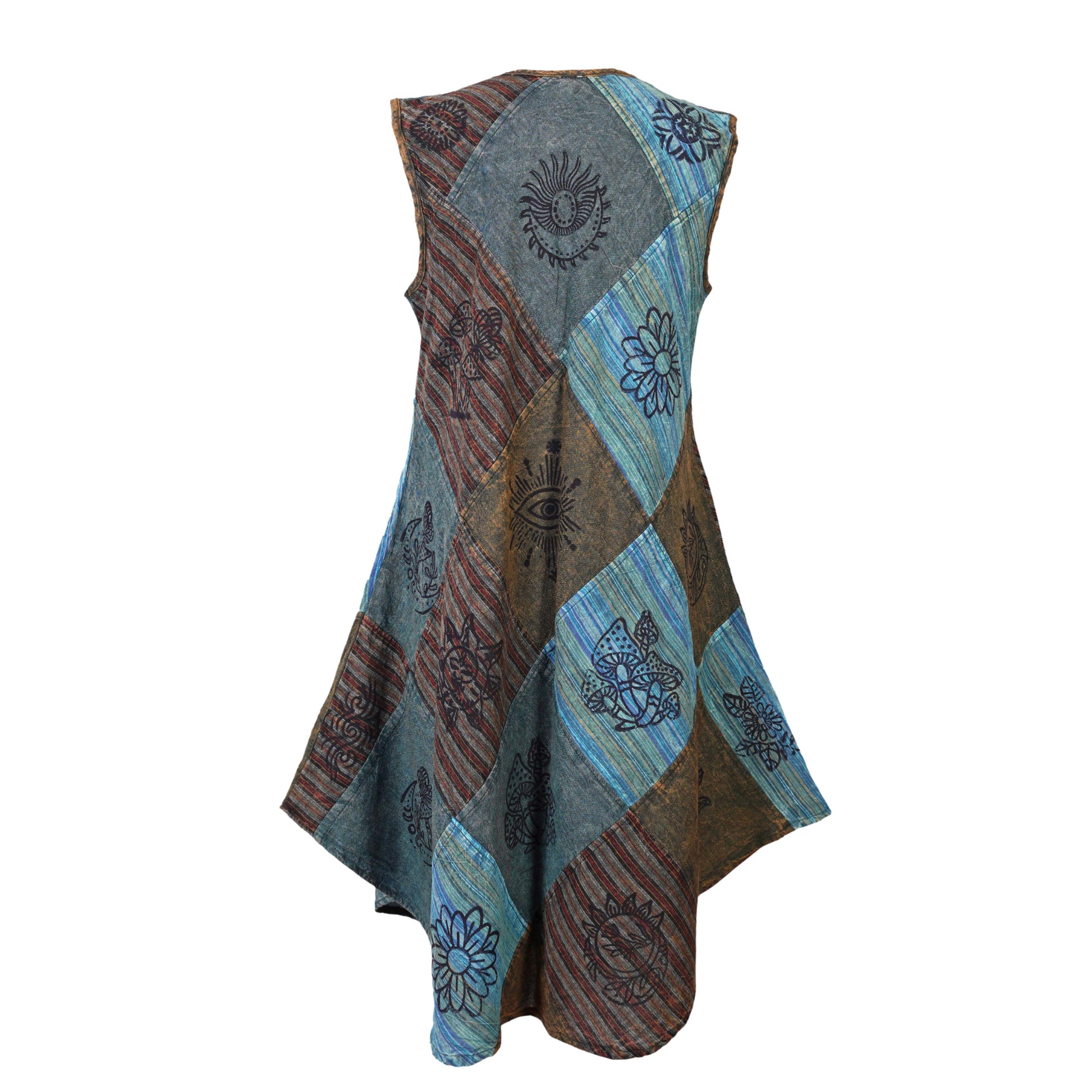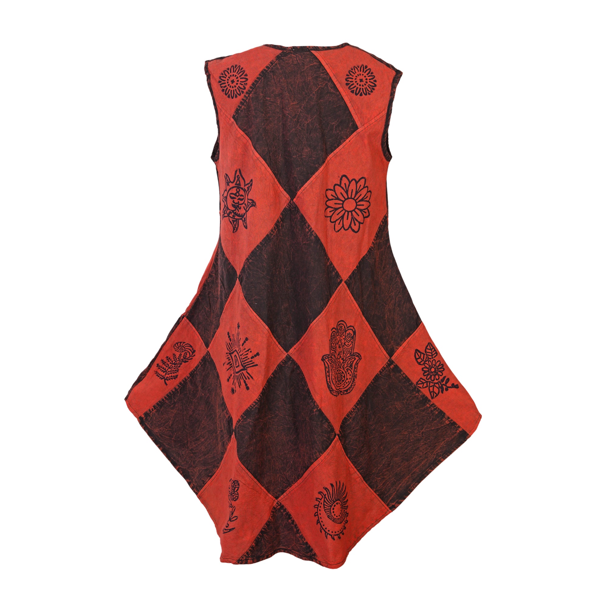 Ezhippie brings you a bohemian-inspired sleeveless patchwork dress crafted from 100% breathable cotton. Featuring hand-printed spiritual and ethnic symbols across a unique diamond-shaped layout, this sun dress for women offers airy comfort and standout style. The sleeveless cut, round neckline, and flared hem create a flattering silhouette perfect for sunny days and casual moments.